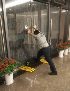 王志富是臺(tái)風(fēng)登陸當(dāng)晚象嶼高尚物業(yè)公司留下值守的54位員工中的一個(gè),他負(fù)責(zé)國(guó)際航運(yùn)中心D棟的安全。D棟處于風(fēng)口位置。凌晨2點(diǎn)多,風(fēng)大作,雨加急,那聲勢(shì)猶如排山倒海,讓這位魁梧的大漢也是心驚。眼看防汛沙袋做的大門加固也無(wú)法阻擋風(fēng)雨的侵入,他不顧只身一人,奮力頂住玻璃大門?!耙坏┯晁嗳氪筇?,流入電梯井,后果不堪設(shè)想!”聞?dòng)嵹s來(lái)增援的4位值守人員也都撲上來(lái)用力頂住大門,五人使足了勁,一個(gè)多小時(shí)后,風(fēng)力減弱,他們以堅(jiān)定的意志戰(zhàn)勝了狂暴的臺(tái)風(fēng),玻璃門沒(méi)有倒下,D棟安全了!