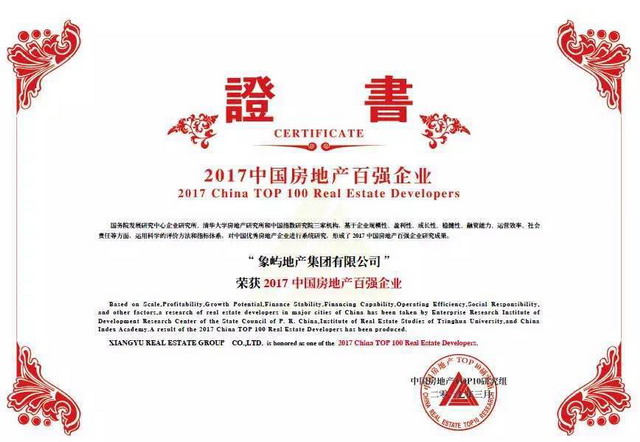 象嶼地產(chǎn)榮獲“2017中國(guó)房地產(chǎn)百?gòu)?qiáng)企業(yè)”