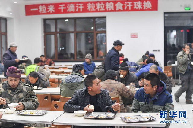 在黑龍江北安市的北安象嶼金谷農(nóng)產(chǎn)有限責(zé)任公司免費(fèi)餐廳中,糧農(nóng)們邊用晚餐邊等待過(guò)磅、卸糧、結(jié)算