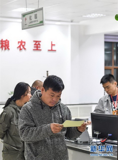 在黑龍江北安市的北安象嶼金谷農(nóng)產(chǎn)有限責(zé)任公司,一位糧農(nóng)在查看糧食化驗(yàn)結(jié)果
