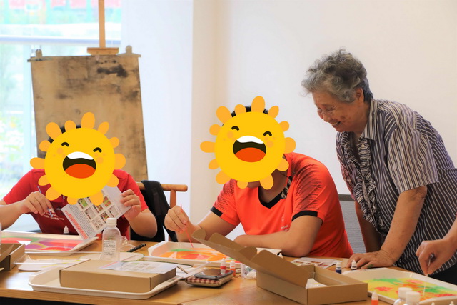 5月9日,在象嶼慈愛老年養(yǎng)護中心,長者們與“星寶”親密互動,共同完成精美的濕拓畫手工扇作品。