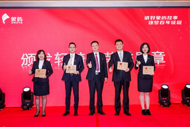 ▲象嶼集團(tuán)黨委副書記、工會主席邵蕰默為宣講人授予“象嶼集團(tuán)黨建理論宣講輕騎兵勛章”