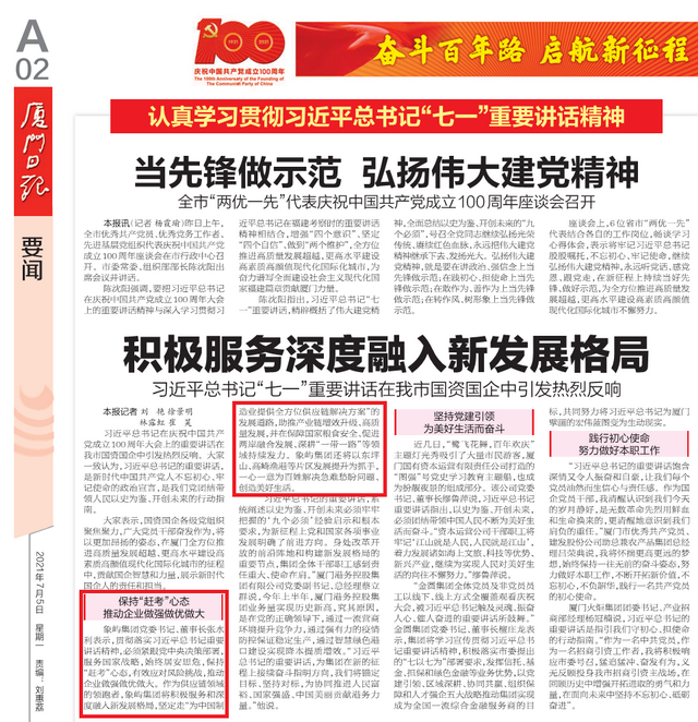 7月5日,《廈門日報》以《積極服務深度融入新發(fā)展格局》為題,報道我市國資國企系統(tǒng)學習貫徹情況,突出報道了象嶼集團黨委書記、董事長張水利的學習心得。