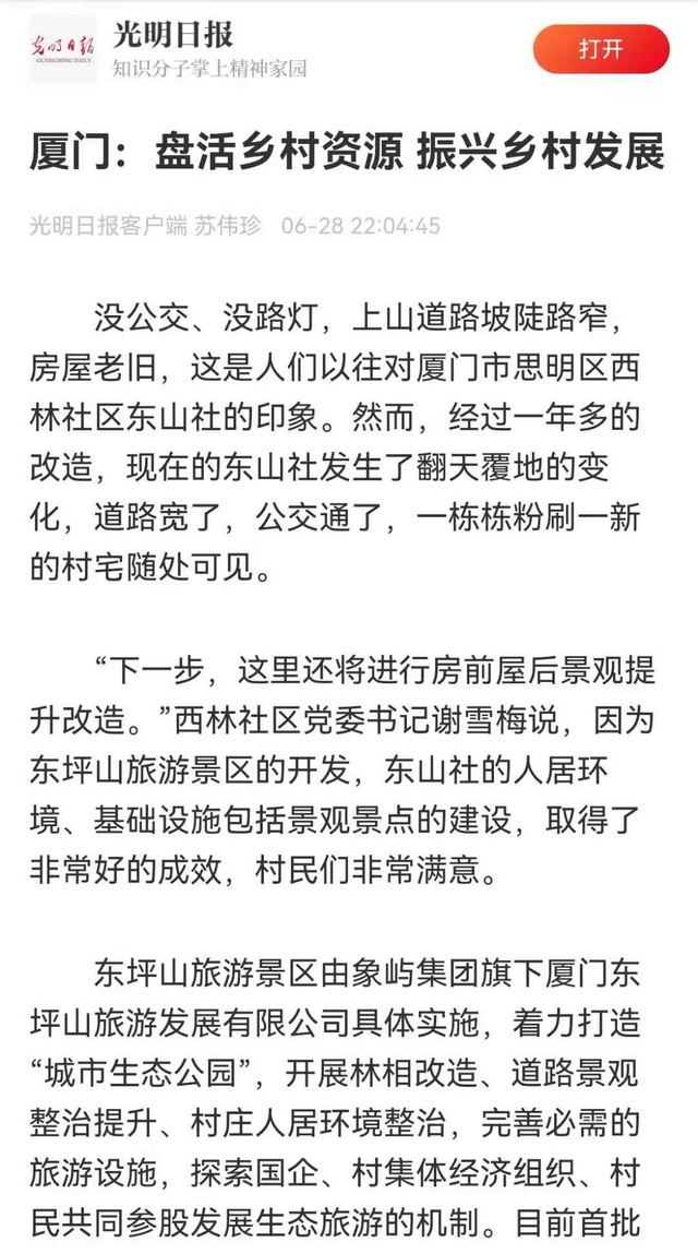 作為東坪山片區(qū)發(fā)展提升項目的具體實施方,象嶼集團(tuán)旗下廈門東坪山旅游發(fā)展有限公司貫徹“生態(tài)美,百姓富”的指導(dǎo)思想,一方面推動村宅改造,一方面圍繞東山社“原鄉(xiāng)東山”的定位和東坪山社“文化東坪”的定位進(jìn)行產(chǎn)業(yè)植入。公司總經(jīng)理周遠(yuǎn)新介紹,村民可自愿選擇保留村宅或者下山安置,對保留村宅的村民,推動老舊危房的改造提升,對下山安置后收回的村宅,則積極引入餐飲、住宿等業(yè)態(tài),提升旅游配套和產(chǎn)業(yè)造血功能。未來,公司將繼續(xù)探索國企、村集體經(jīng)濟(jì)組織、村民共同參股發(fā)展生態(tài)旅游的新機(jī)制、新模式。