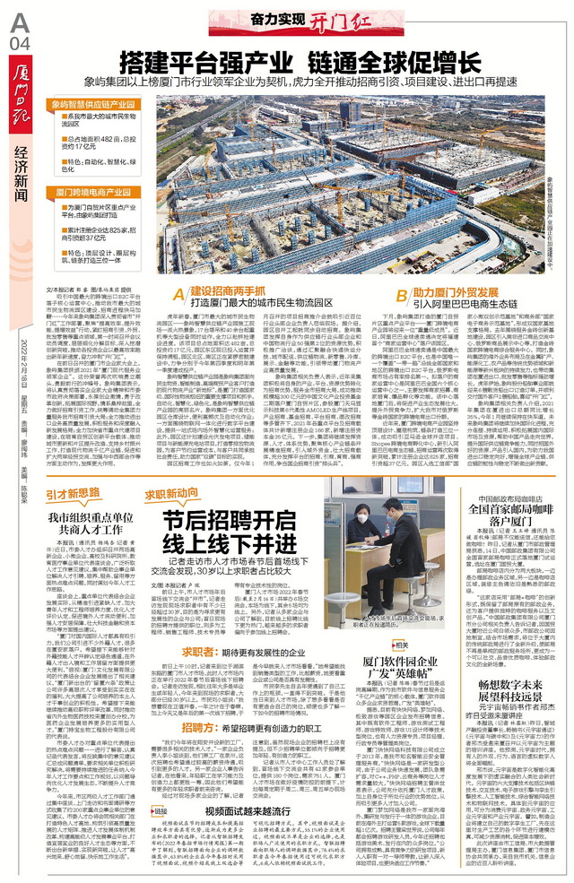 象嶼集團相關負責人介紹,2021年集團在廈進出口總額同比增長35%,今年1月繼續(xù)保持在快車道。未來象嶼集團將繼續(xù)加快國際化進程,充分連接、持續(xù)運用、積極拓展國內國際市場及資源,幫助中國產品走向世界,提升國際供應鏈競爭能力,同時把國外好的資源、產品引入國內,為助力我國進出口穩(wěn)定向好,增強全球產業(yè)鏈、供應鏈的韌性與穩(wěn)定不斷做出新貢獻。