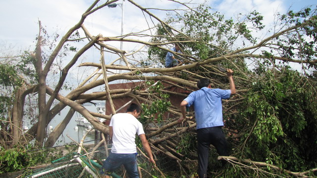 “莫蘭蒂”的威力是巨大的,在其登陸前兩個(gè)小時(shí),港區(qū)電壓開(kāi)始呈現(xiàn)不穩(wěn)定狀態(tài),時(shí)亮?xí)r暗。蘇展是值守港區(qū)的電工,為了讓安置在避險(xiǎn)中心的數(shù)千船員有明亮的燈光,他不顧個(gè)人安危,冒著狂風(fēng)暴雨前往配電室進(jìn)行檢查。路上被風(fēng)刮起的鐵板將衣服劃破,所幸沒(méi)有受傷?!半娎|溝進(jìn)水導(dǎo)致了短路,港區(qū)全部跳閘停電,路燈燈頭也被摧毀。”蘇展有些無(wú)奈,雖然如此,他仍堅(jiān)守在配電室直至風(fēng)雨漸收,確保了配電室設(shè)備沒(méi)有受到破壞。