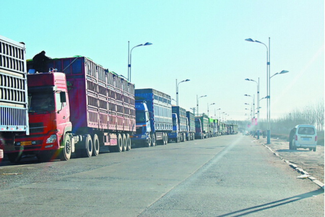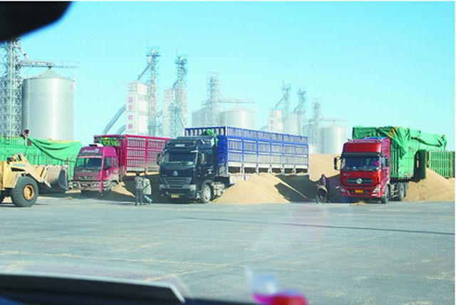 富錦象嶼金谷農(nóng)產(chǎn)門外排隊等候的送糧車