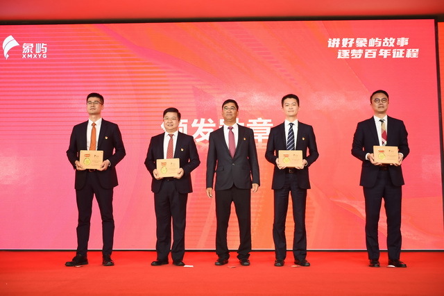 ▲象嶼集團(tuán)黨委書記、董事長(zhǎng)張水利,象嶼集團(tuán)黨委副書記、總裁陳方為宣講人授予“象嶼集團(tuán)黨建理論宣講輕騎兵勛章”