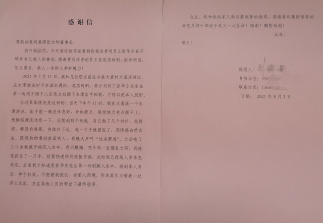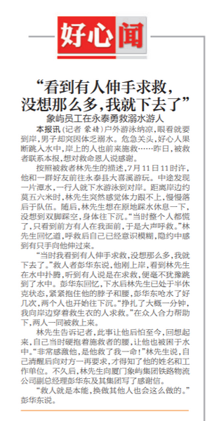 “感謝象嶼集團(tuán)培養(yǎng)的好黨員、好干部給予我又一次生命!”8月2日上午,林先生將一面印有“治企有方干部優(yōu)秀 危難時(shí)刻英勇救人”的錦旗和一封感謝信送到象嶼集團(tuán),表達(dá)了他對象嶼集團(tuán)員工彭華東的感激之情。8月3日出版的《廈門日報(bào)》也報(bào)道了這一救人義舉。